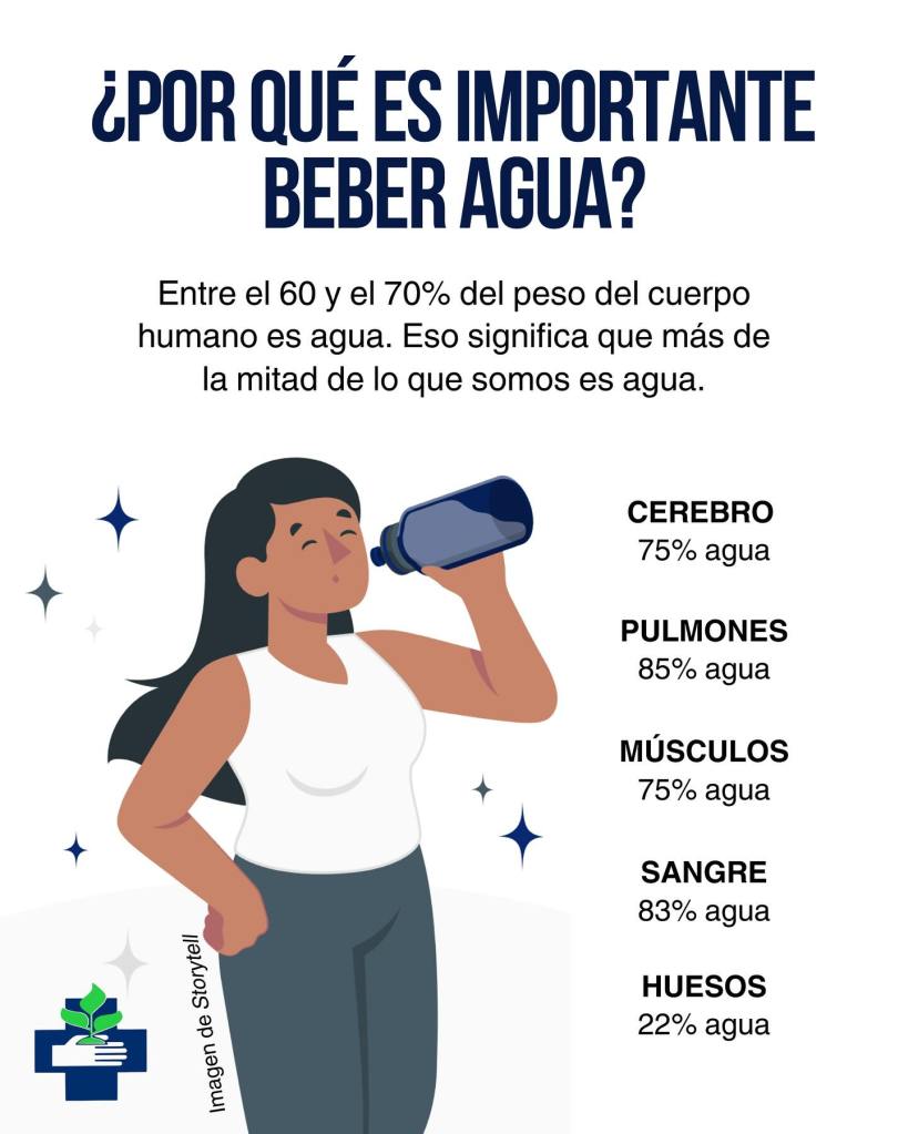 ¿Sabías que el 70% del peso de nuestro cuerpo es agua? Beber agua no solo hidrata: protege órganos, transporta nutrientes, regula la temperatura, mantiene el cerebro activo y ayuda a eliminar toxinas.