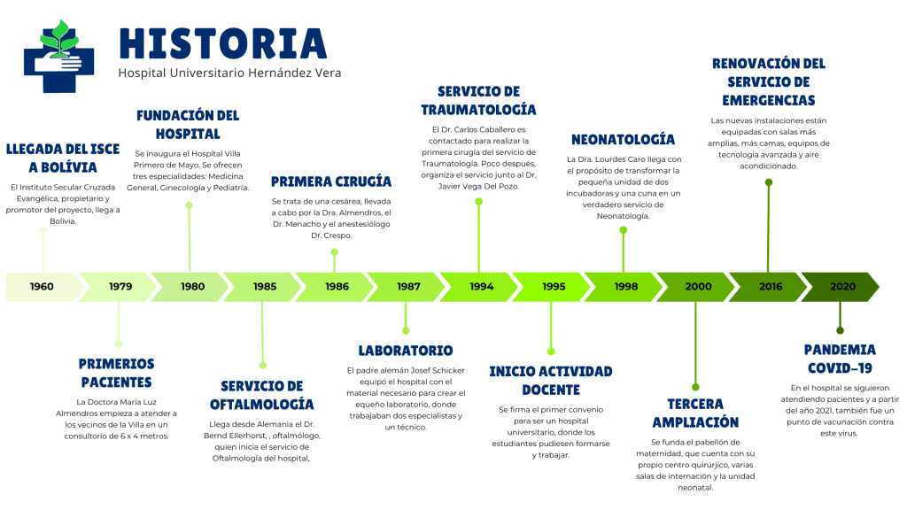 El Hospital Universitario Hernández Vera está ubicado en la Villa Primero de Mayo, uno de los distritos más poblados de Santa Cruz de la Sierra. En 2024, este distrito cuenta con más de 500,000 habitantes, muchos de los cuales viven en condiciones de pobreza y carecen de acceso a un empleo regular. El hospital fue fundado en 1980 gracias a la iniciativa del Padre Doroteo Hernández Vera, sacerdote español y fundador del Instituto Secular Cruzada Evangélica. Durante una visita a la zona, el Padre Doroteo percibió la gran necesidad de servicios de salud y encargó el proyecto a la Dra. Ma. Luz Almendros Pasantino, consagrada del Instituto Secular Cruzada Evangélica (ISCE) y ginecóloga, quien acababa de terminar su especialización en Madrid.